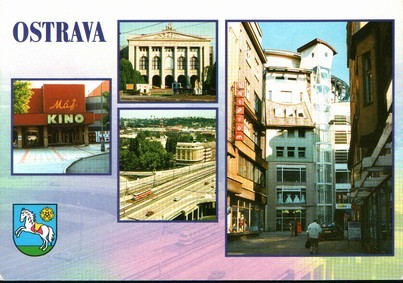 Na dobové pohlednici zcela vlevo kino Máj v Ostravě - zrušeno roku 2001.